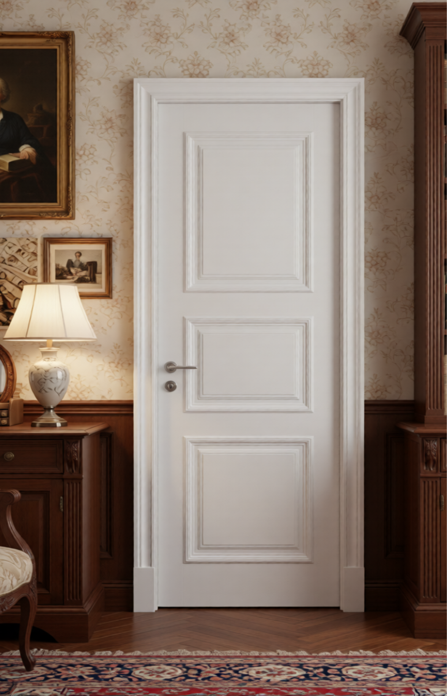 Дверь выполнена в щитовой классической конструкции, что делает её идеальной для интерьеров в стиле **неоклассика, классический, прованс, английский стиль и другие традиционные направления**.