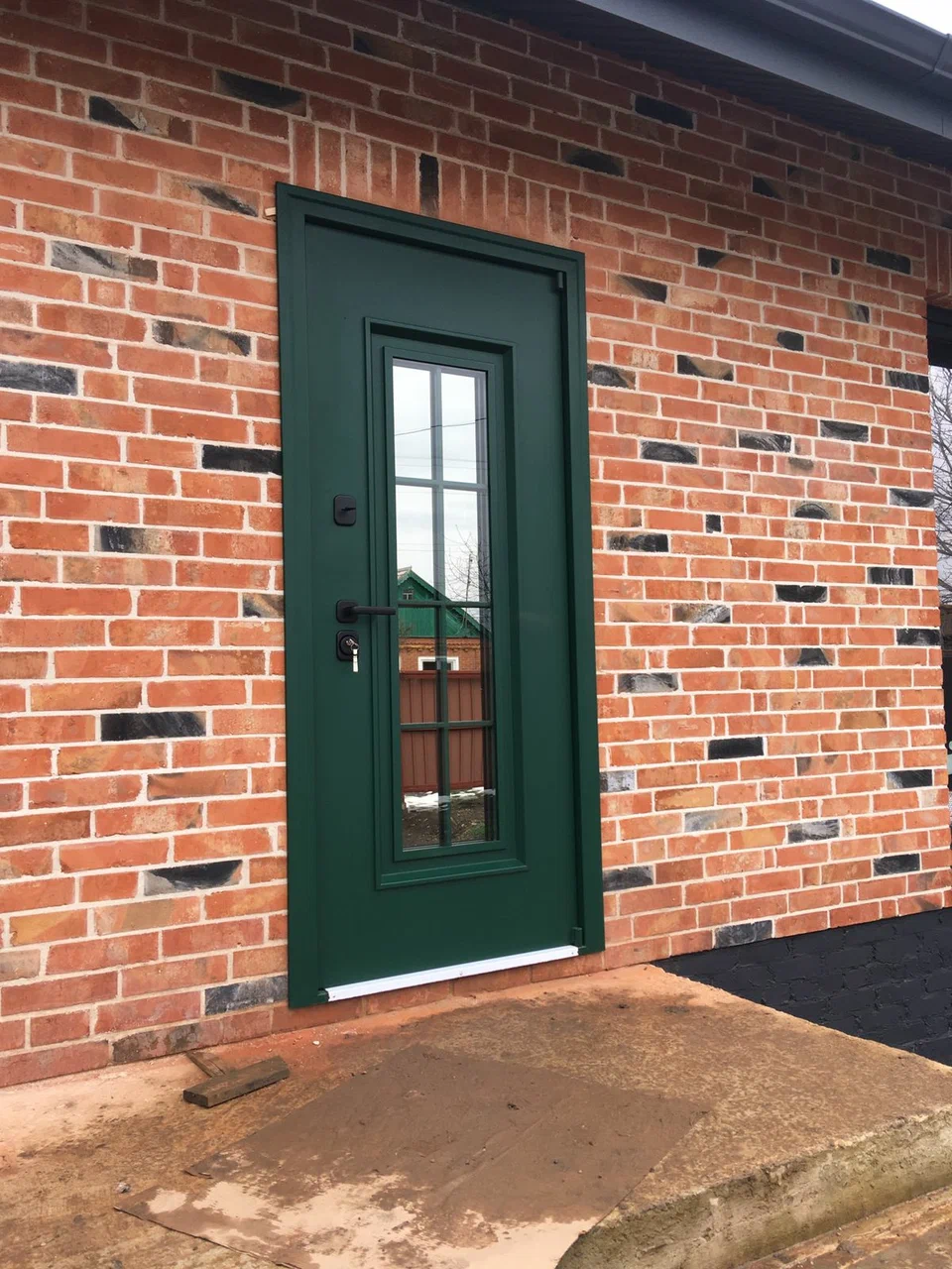 Металлическое полотно с утеплением и периметральным уплотнением защищает от продуваний и осадков. Узкое вертикальное остекление со стеклопакетом пропускает дневной свет в прихожую и визуально вытягивает проём. Порошковая окраска в благородном зелёном оттенке устойчива к ультрафиолету и механическим воздействиям, гармонирует с кирпичным фасадом. Современная фурнитура обеспечивает удобство и безопасность.